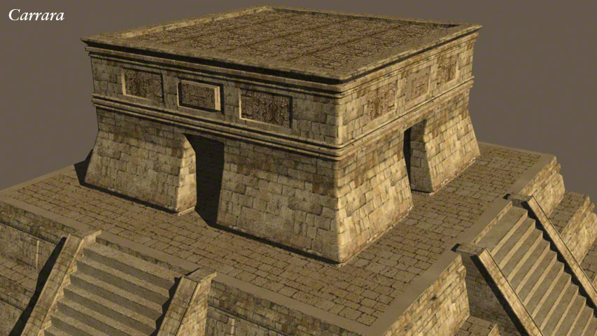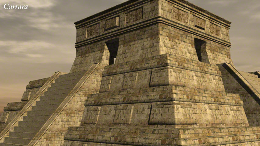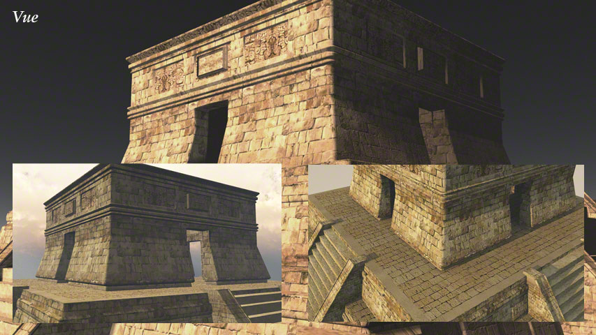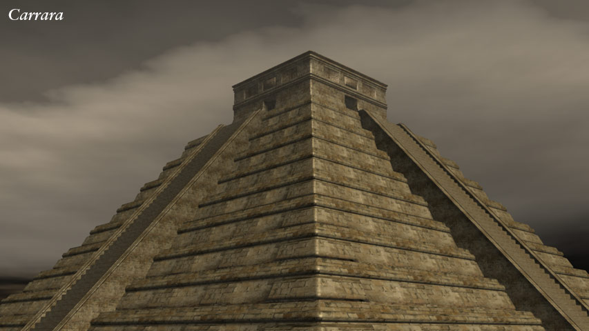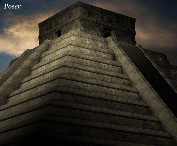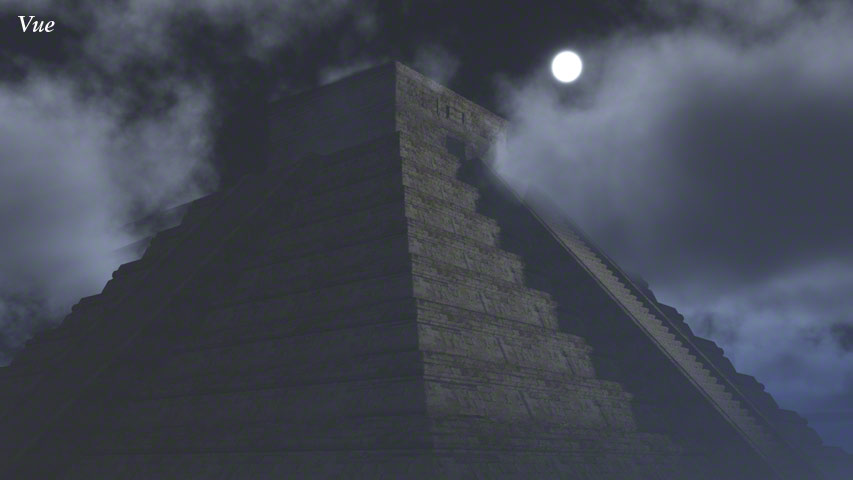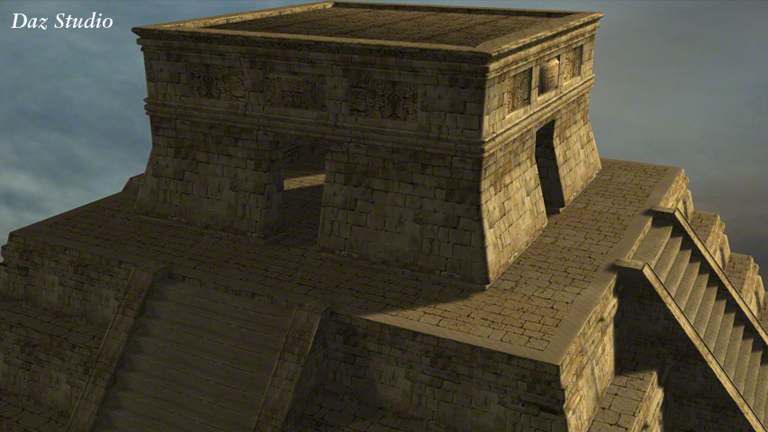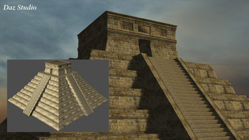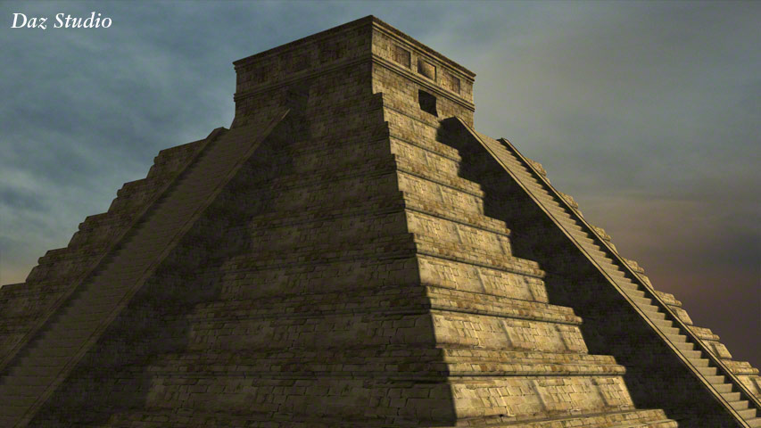 This Mayan style pyramid was made in Carrara for one of my own pictures: 'Discovering New Gods' – Seen in the Human Gallery. It was once offered as a free gift to newsletter subscribers in .obj format so it could be imported into many programs, such as Daz|Studio, Bryce, Carrara, Poser and Vue etc. These example renders are produced in varying programs.