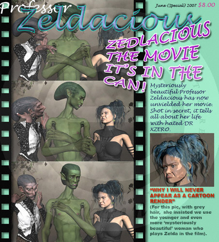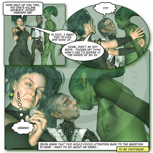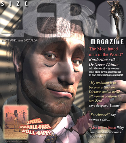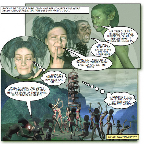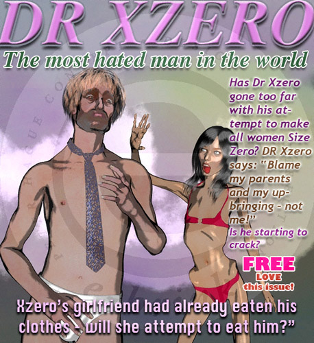 This is a short concept board for the 'Size Zero' idea. In which Dr Xzero turns himself into a cartoon character and seeks to make all women conform to size zero. Finally, starving and ravenous, they turn against him. Zelda, his ex-wife and sworn enemy, comes up with a perfect solution. There's more of Zelda, Dr Xzero, Emo and Anthony on their own pages in this gallery.